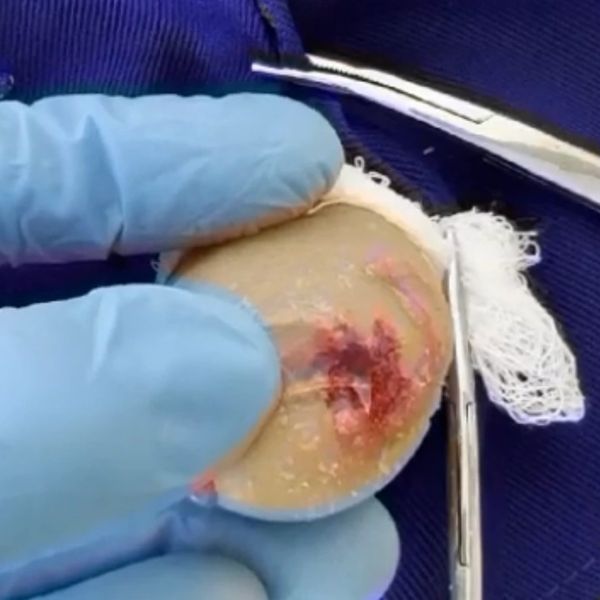 A pele sintética "MedSkills Skin" existe em diversos modelos, visando atender a diferentes objetivos de aprendizado. Aqui, um com lesão para sutura e anestesia local. Vale a pena observar que toda a extensão do dispositivo pode ser utilizada para incisão, infiltração anestésica ou ressecção.